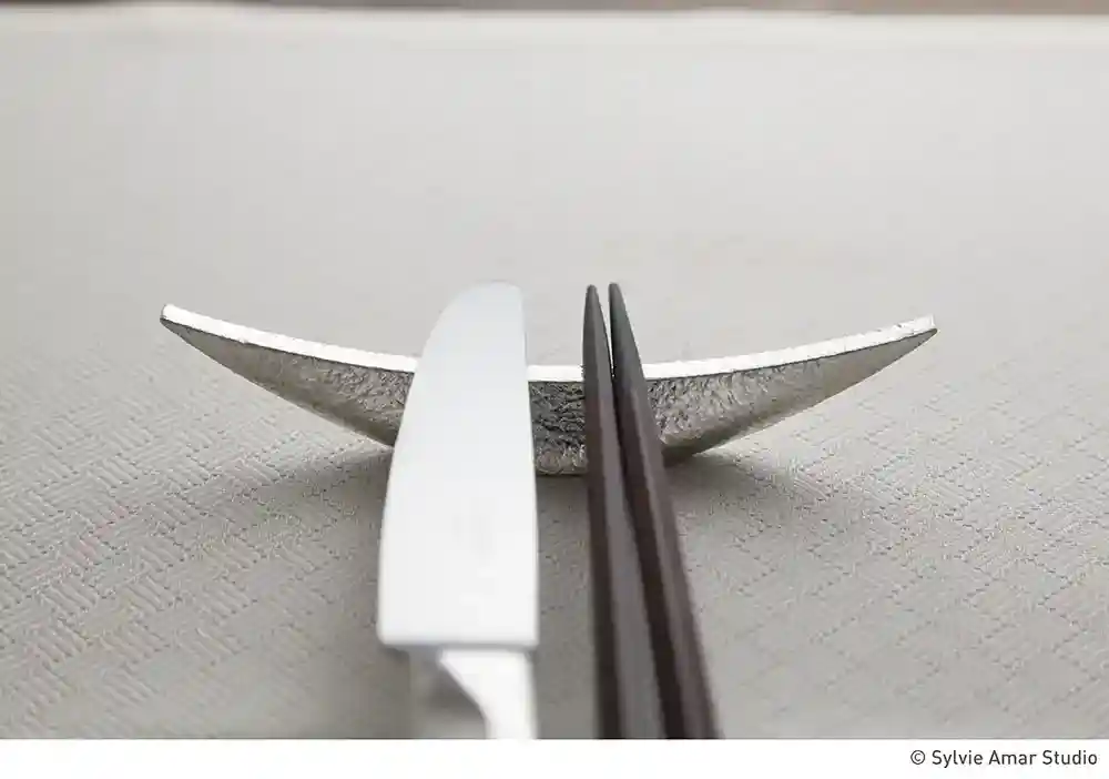 地平線筷架是與Sylvie Amar法國設計師聯名合作的優雅作品。其名稱「Orizon」在法語中意為「地平線」,設計靈感取自地平線的簡潔與無限延伸。設計師運用極簡的線條,完美勾勒出純錫材質溫潤而內斂的光澤,讓這份簡約之美得以充分展現。