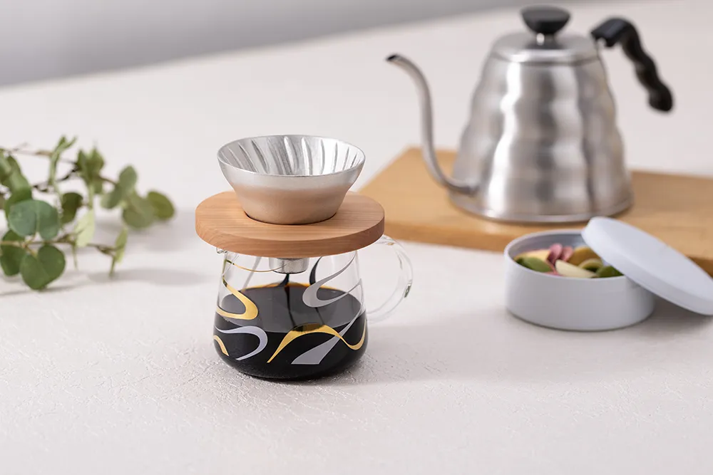 金屬流動的奢華專為台灣打造的設計款下壺,圖案概念來自於鑄造時錫與黃銅的流動瞬間,閃耀著獨一無二的奢華光彩的黃銅部分為黃金貼附燒製而成。無論是珍藏饋贈或犒賞自己,這套融合頂級工藝與藝術美學的禮盒,都能為您的咖啡時光,獻上獨一無二的感官盛宴。