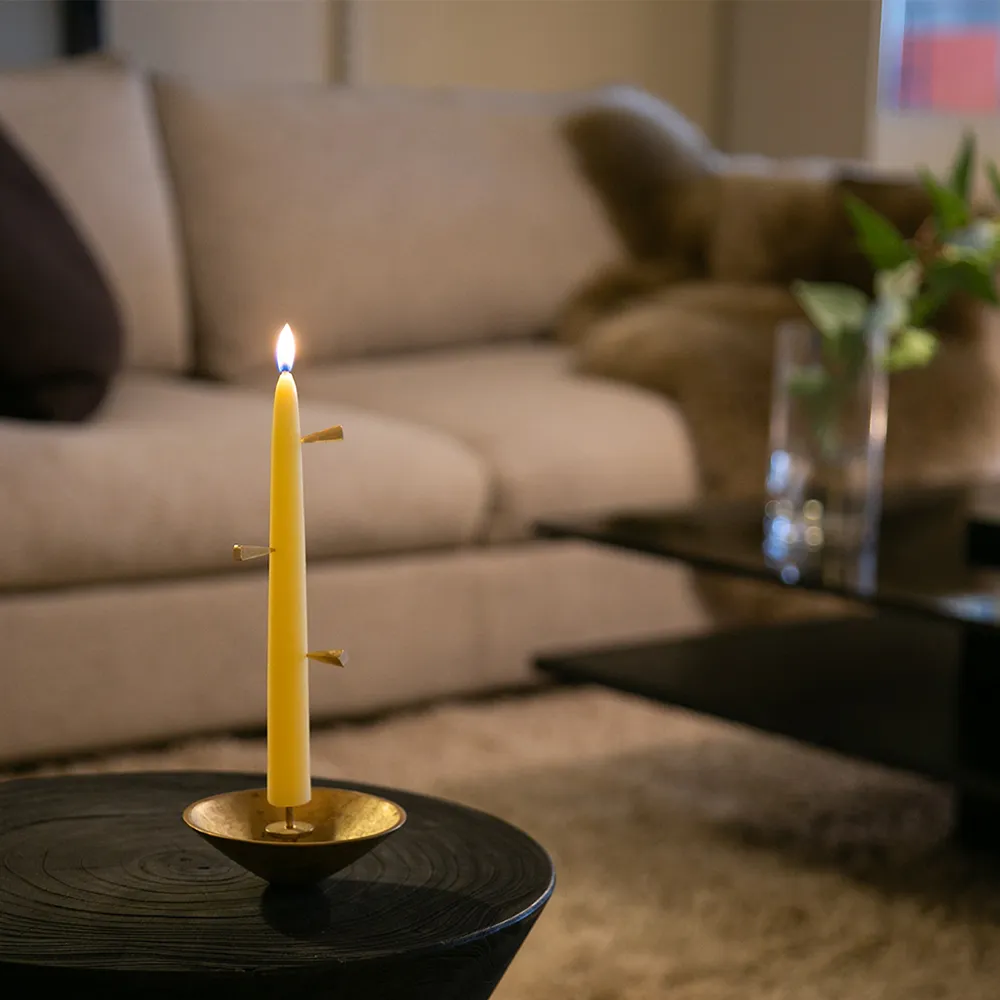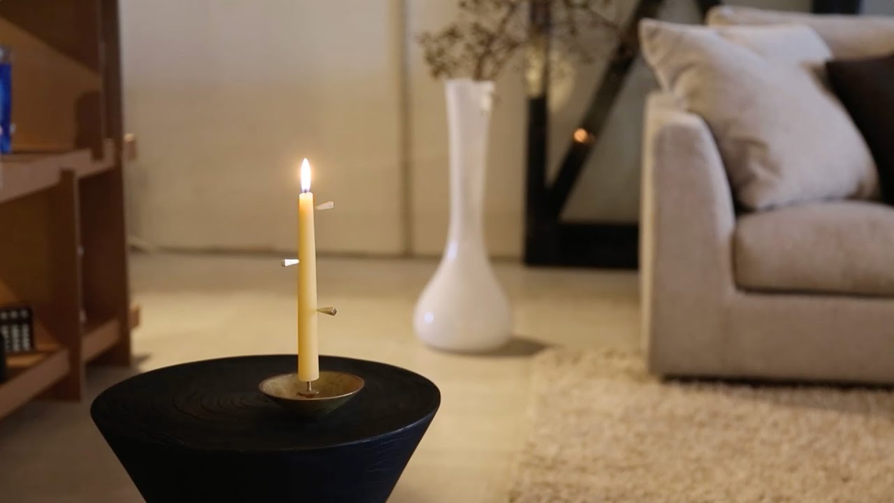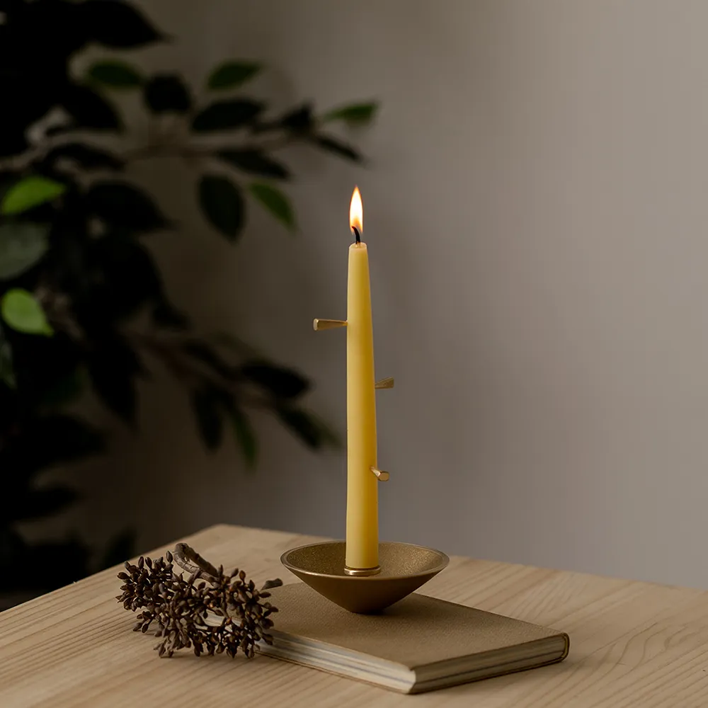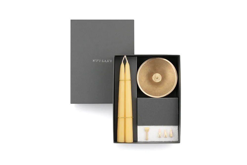 這是一款能以聲音傳遞時間流逝的特別燭台套組,隨著蠟燭的慢慢地融化,燭上的黃銅釘瞬間落下,發出如鈴聲般清脆的聲響。燭台部分以富山縣高岡市傳承已久的黃銅鑄造與金屬加工技術打造,由職人一件件手工鑄造、精心製成。當燭光搖曳、微光閃爍,隨之響起的叮噹聲,猶如時光,輕敲心弦,靜靜陪伴夜的深處。在冥想、閱讀或泡茶的片刻,都為生活添上一縷詩意的寧靜。