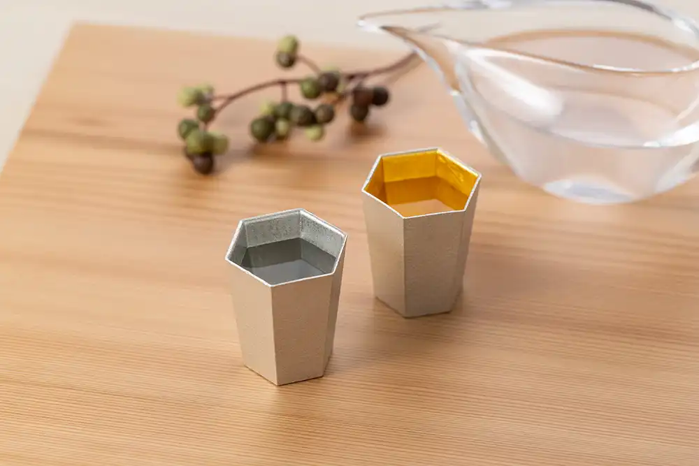 純錫・金箔六角純錫杯對杯禮盒,以直線、時尚的設計搭配精美的金箔貼飾,獨特的造型本身就極具美感,兩只六角純錫杯對杯組合時,其華麗與優雅感更是倍增。由於使用100%純錫這種柔軟材質,每一只酒杯都需經過職人手工逐一精心鑄造完成,隨後再由金澤的職人親手將金箔一片片貼飾上去,最終才成就了這份獨特的工藝之美。